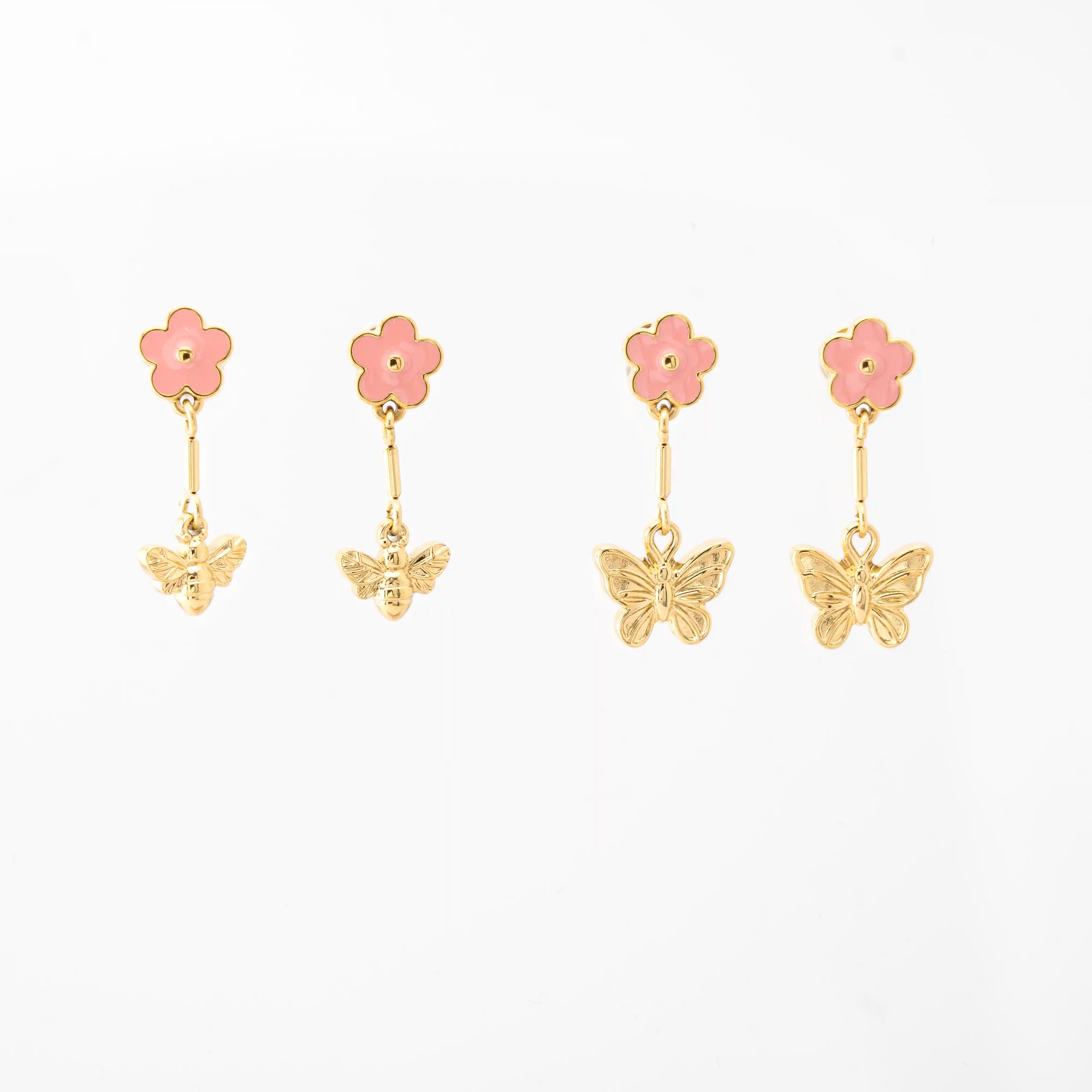 The showy big sister to the bee style. Featuring the same pink enamel flower stud and identical dangle length, this variation makes a bolder statement with a larger sculpted butterfly charm. Crafted in 18K gold-plated surgical steel, the broader wings add presence and catch the light beautifully. Same proportions. Bigger wings. More impact.